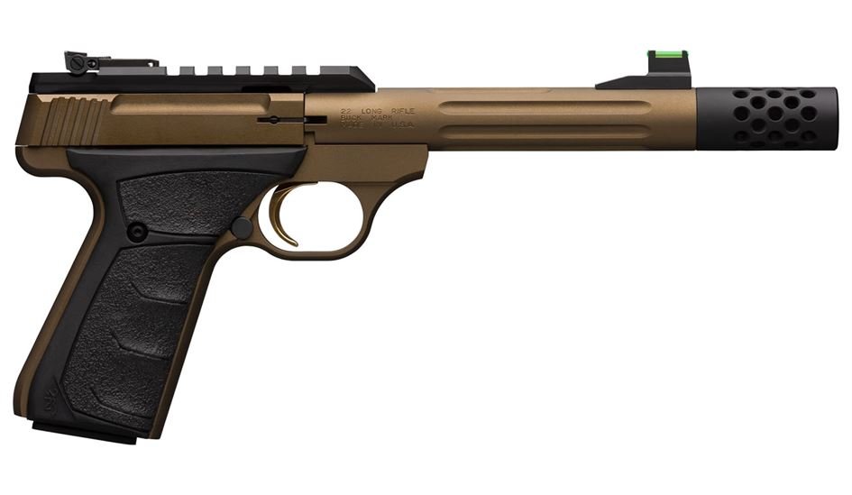 The Buck Mark Plus Speed features a Fluted steel bull barrel, Picatinny optics rail, suppressor ready threaded barrel, muzzle brake, UFX overmolded grips, fiber-optic front sight, and an adjustable rear sight.