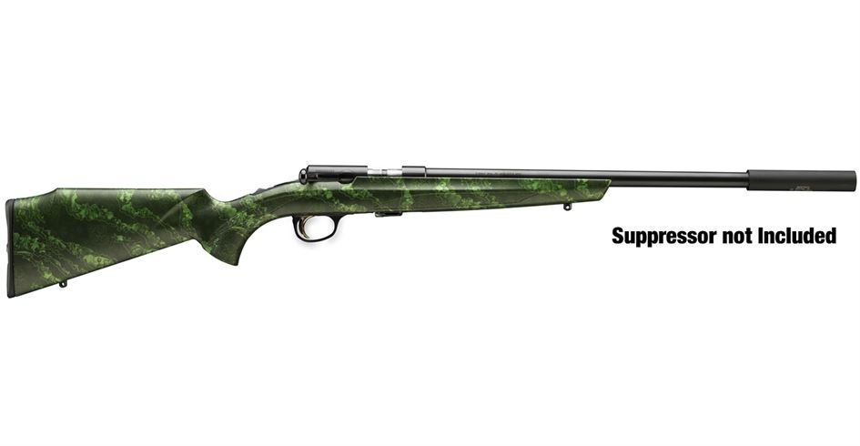 The Browning T-Bolt Varmint Green Reaper features a black/green reaper Z patern Dura-Touch finish composite stock, adjustable trigger, and a medium weight target suppressor ready free floated barrel.